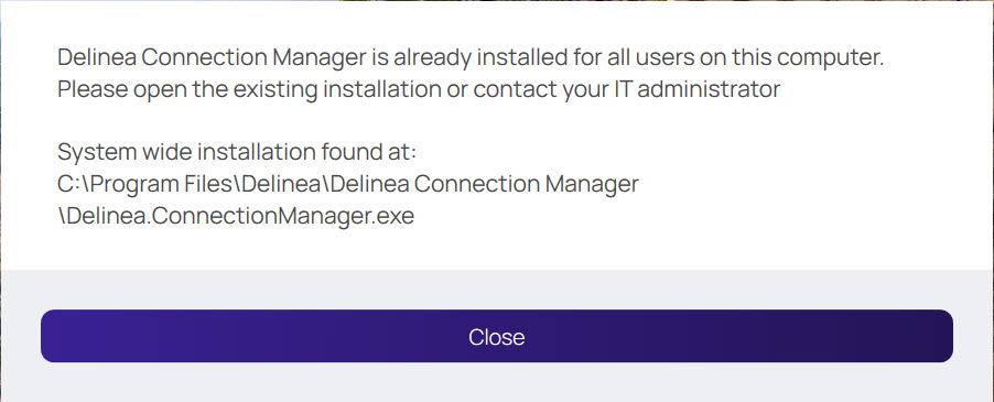 If an existing administrator installation is detected, the setup will proceed with the administrator installation by default. To access the user installation option, you must first completely uninstall Connection Manager and then perform a fresh installation.