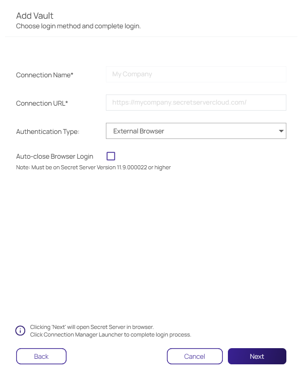 Select External Browser from the Authentication Type dropdown menu. If you would like your browser to auto-close upon successful login, check the Auto-close Browser Login box.