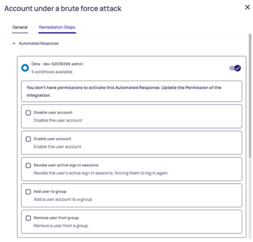 If permissions are not correctly configured for the integration, an error message appears: "You don’t have permissions to activate this Automated Response. Update the Permission of the Integration."