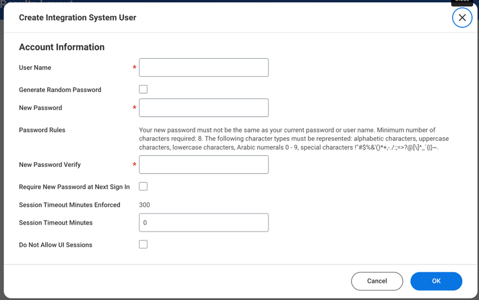 In the Workday search bar, type Create Integration System User and select the task. The Create Integration System User page opens