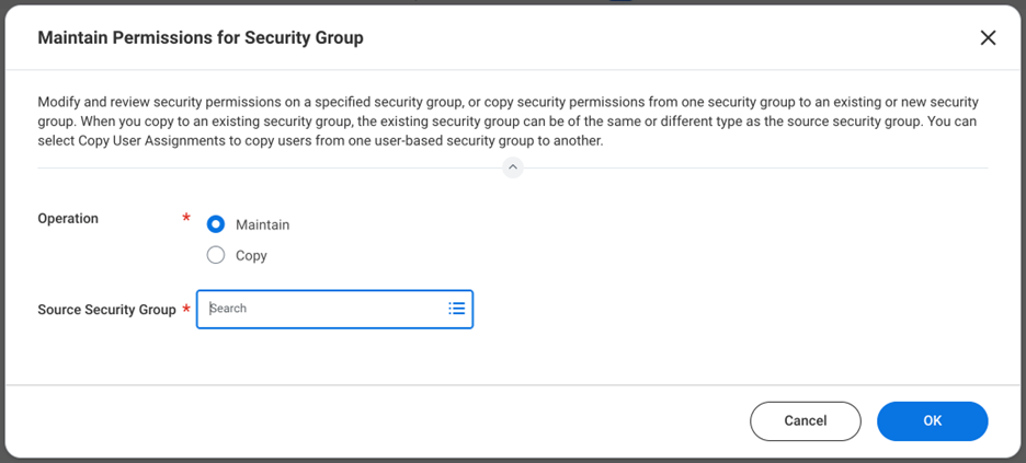 In the Workday search bar, enter Maintain Permissions for Security Group and select the task. The Maintain Security Group page opens.
