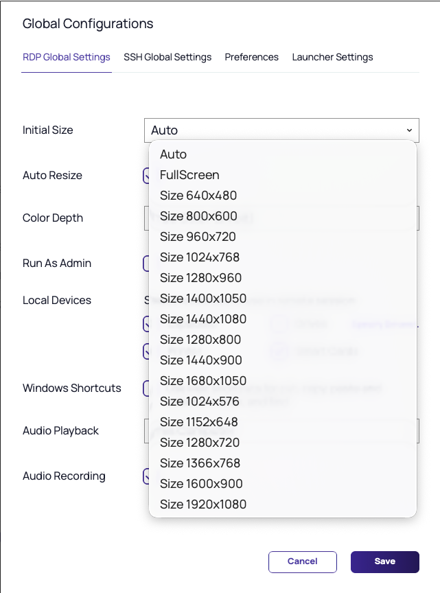 In the Global RDP Settings, users are able to select either a full screen, automatic or fixed desktop size: