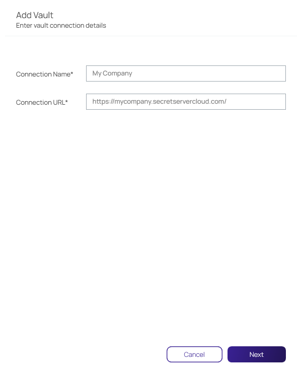Enter your Secret Server Connection Name and Connection URL and click Next.
