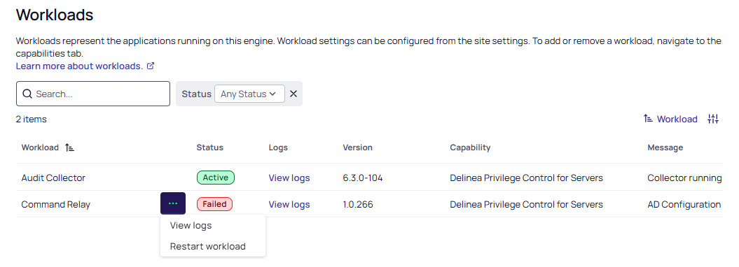 Scroll down to the Workloads area of the page. A list of the currently configured workloads is displayed.