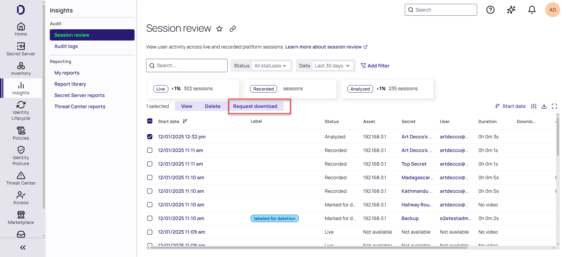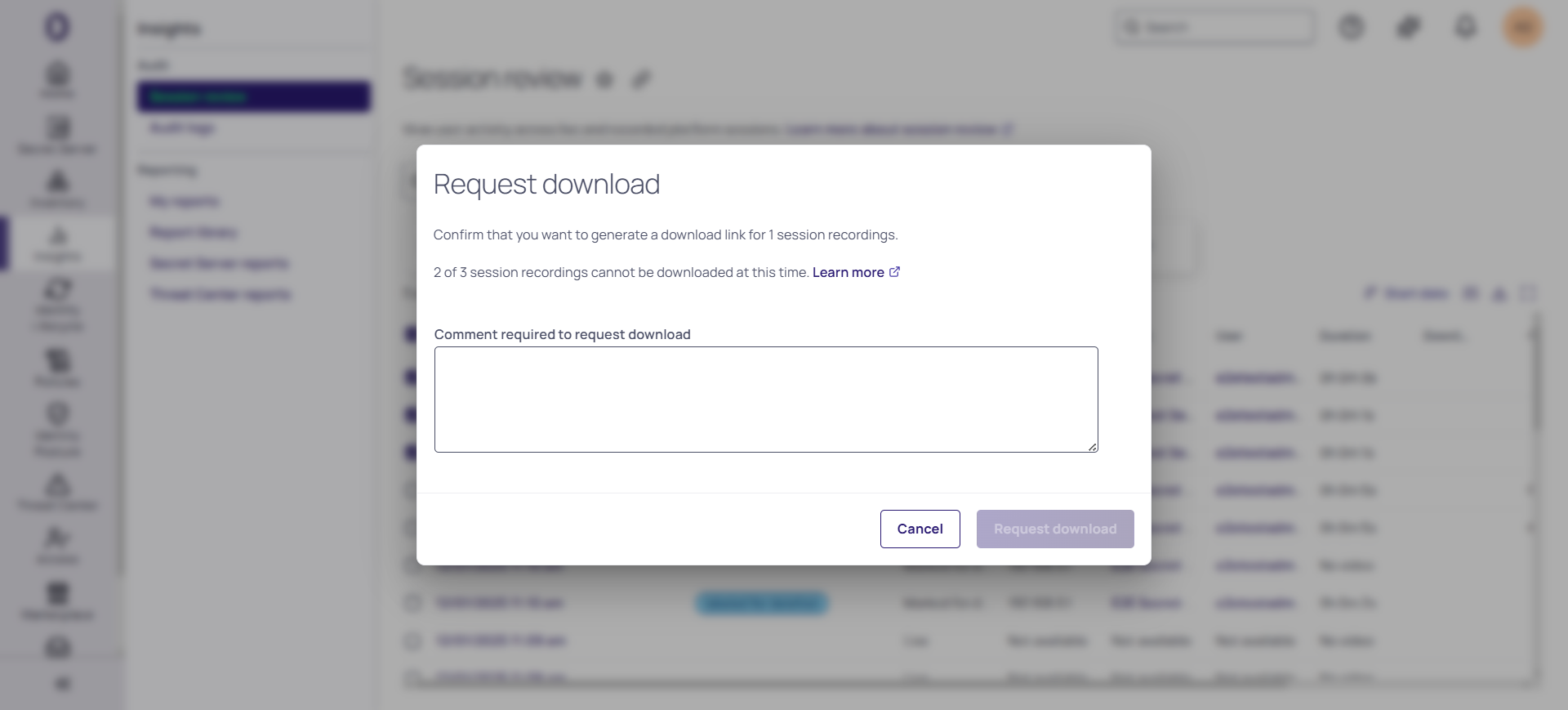 Navigate to the Session Review page and select Request download from the three dots menu.