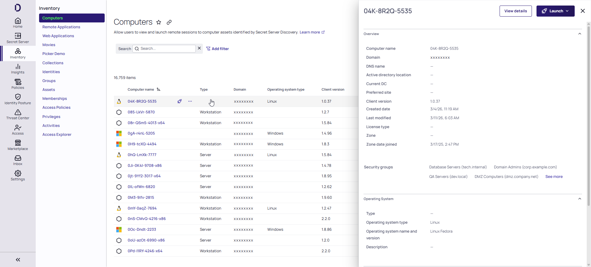 The platform's Computers inventory provides an asset-centric view of all discovered computers in one place. From there you can efficiently manage and initiate remote sessions on your computer assets. To learn more about Secret Server’s discovery service, see Secret Server Discovery.
