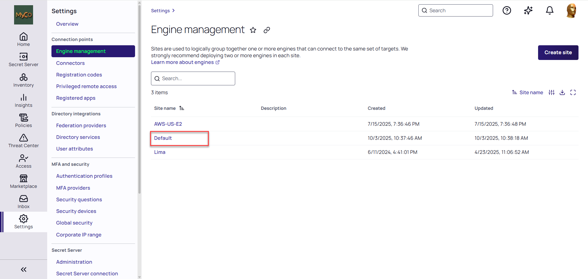 If there is no matching site name or if no Platform Engines with PRA workloads are deployed to the matching site, users will be prompted to select an appropriate site to facilitate the connection. This ensures that the connection can still be established even if automatic site selection is not possible.. See Managing Engine Sites and Secret Server sites for more information.
