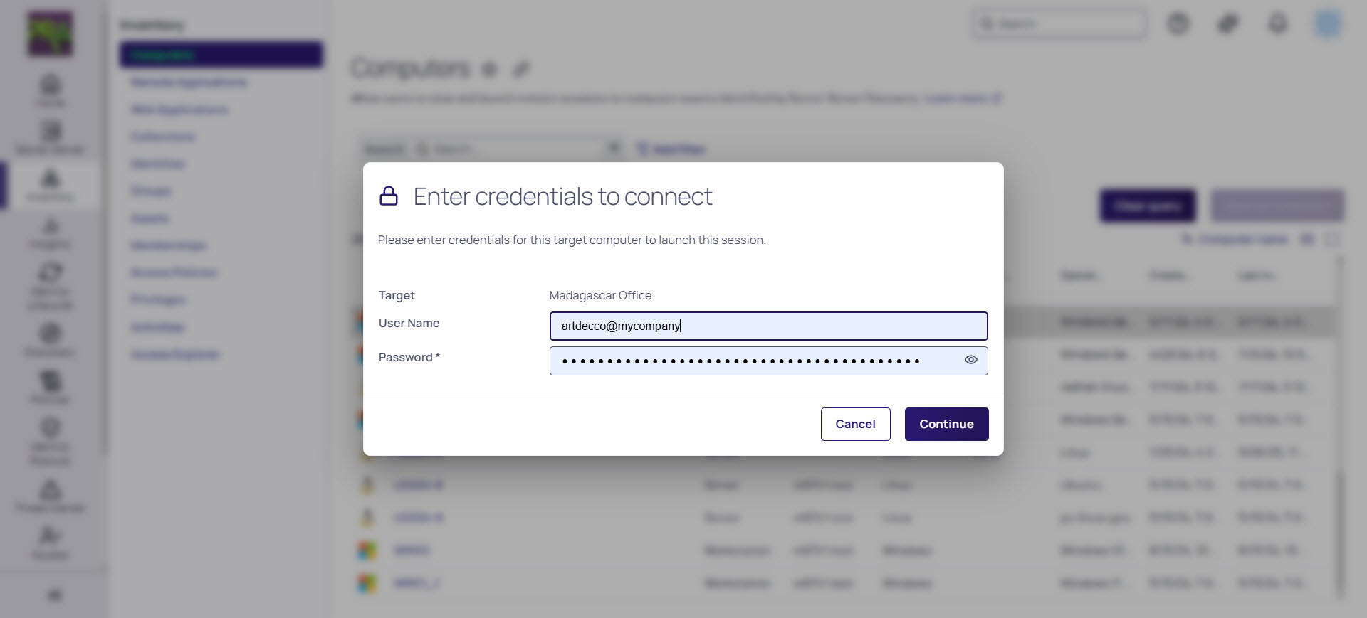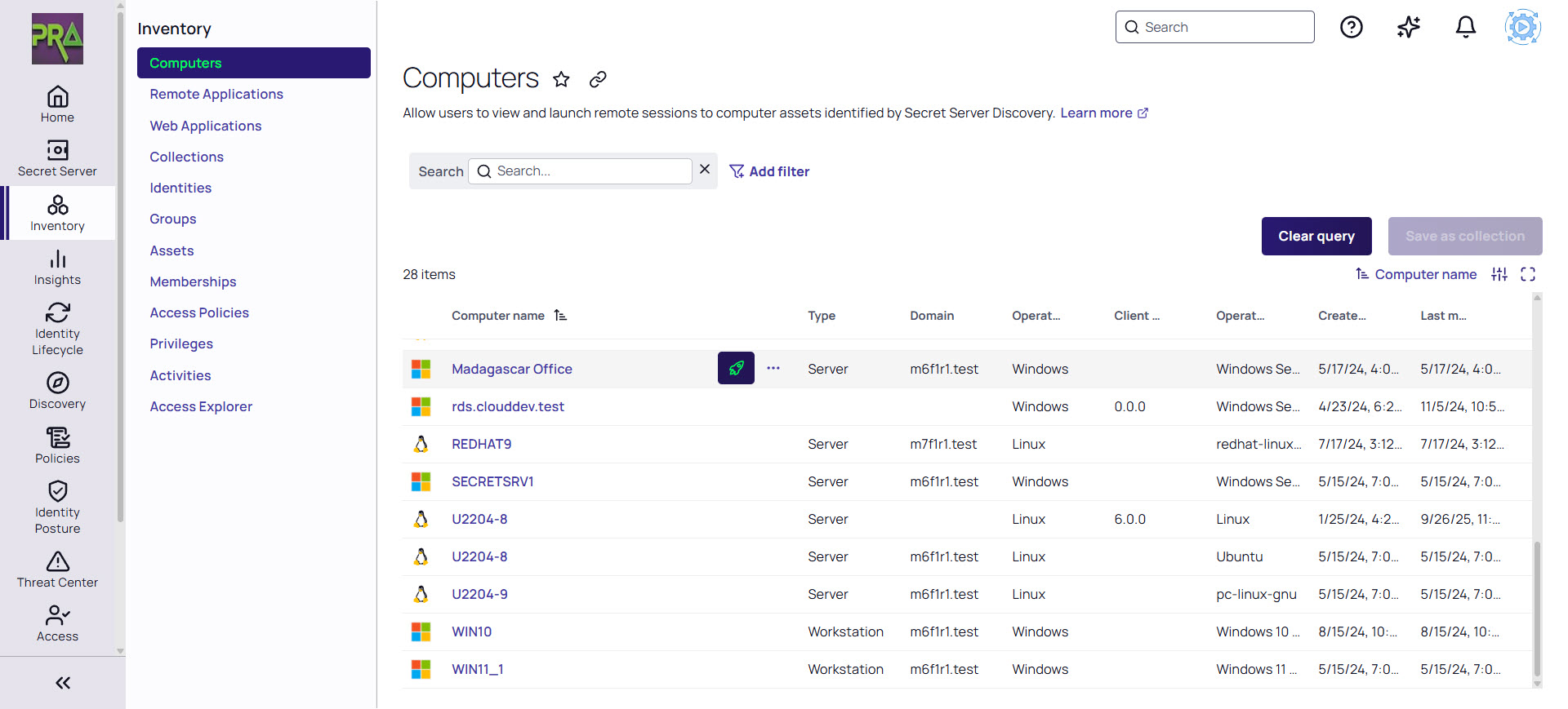 In the Inventory section, locate the Computer asset to which you would like to launch a remote session.