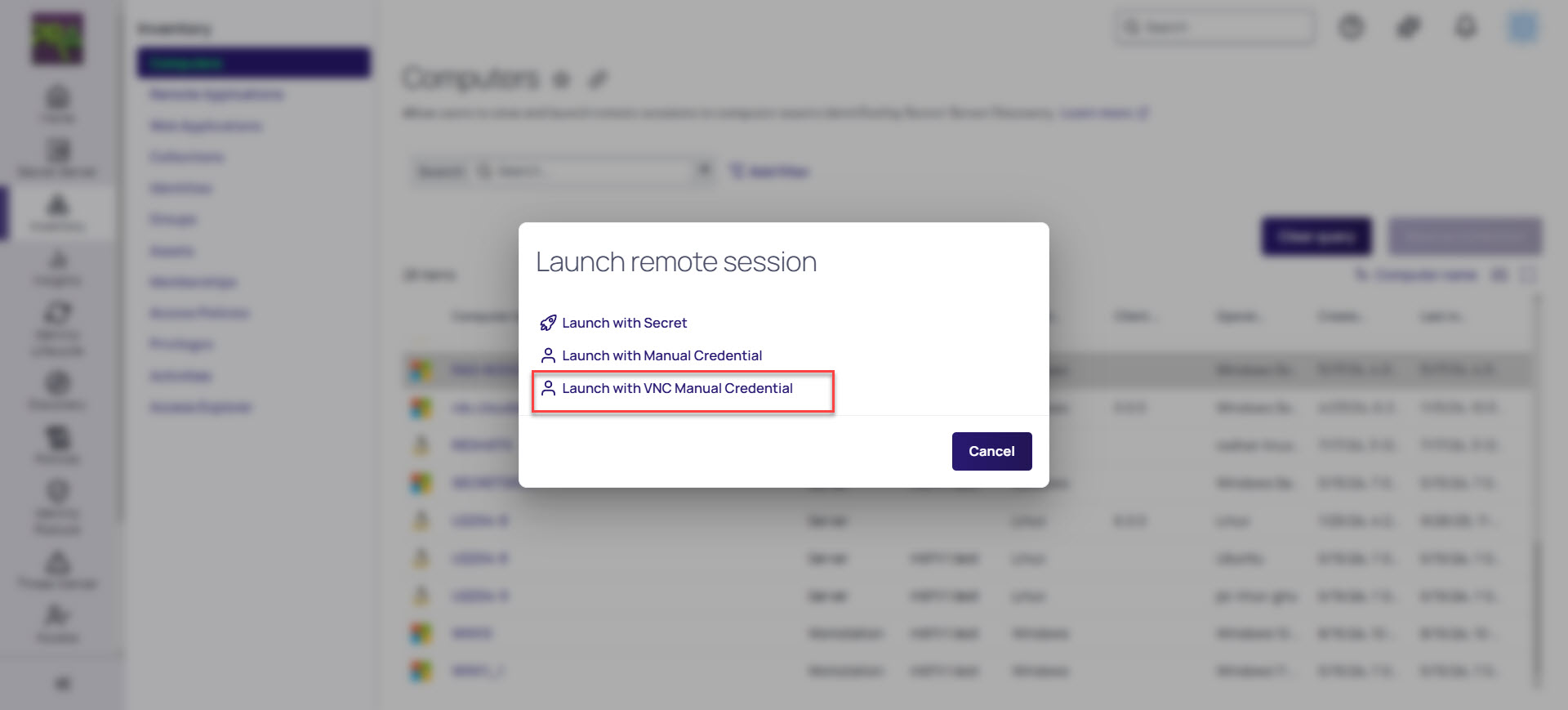At this time, all Inventory computer assets will have a Launch with VNC, regardless of whether the asset is running a VNC host service or not. Launching a VNC connection to an asset that does not have a VNC host service will fail.