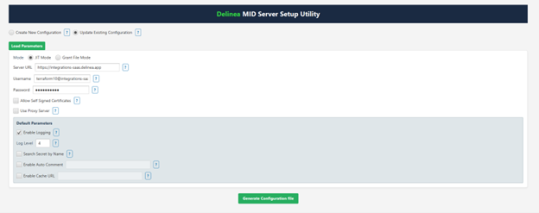 The Mode field determines how the Delinea MidServer Setup Utility authenticates with the Delinea Platform. It is selected based on your config.xml file, but you can change the Mode or any parameter values as needed before generating the configuration file.