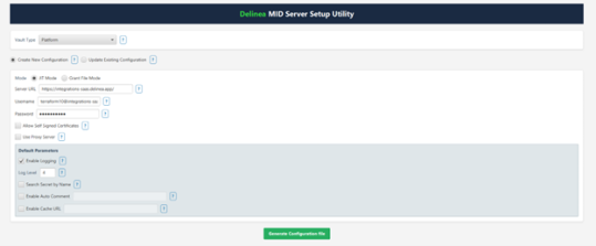 After establishing the basic requirements for creating a service account and a discovery secret, you need to run the Delinea MidServer Setup Utility. This utility is designed to generate all necessary parameters while providing a secure and reliable method for storing user credentials, avoiding the use of plain text in the MidServer configuration file. It facilitates the configuration of the connection between your MID Server and Delinea Platform.
