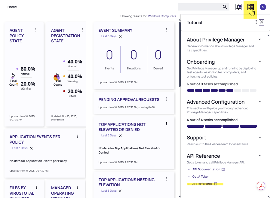 In the Privilege Manager Console in the upper right-hand corner of the page, navigate to the Help icon.