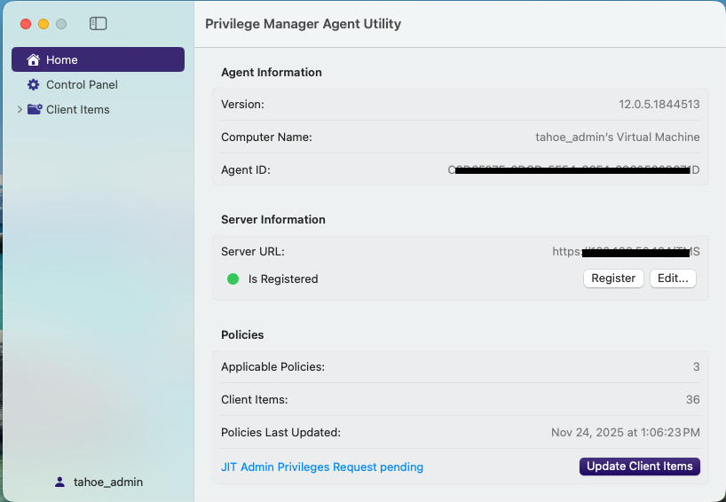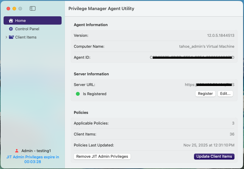 You request administrator privileges using the Privilege Manager Agent Utility or through the menu bar Icon with Request JIT Admin Privileges….