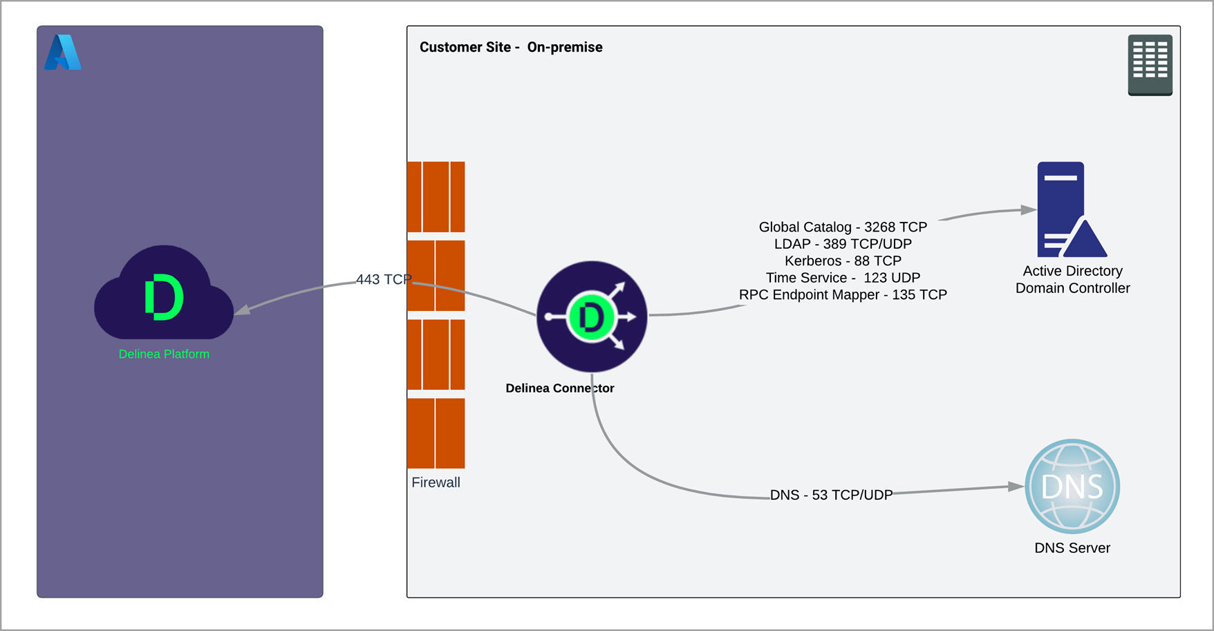 Internal access on port 53 TCP/UDP from Delinea Connector to DNS server for name resolution (this might be the DC itself depending on your environment)