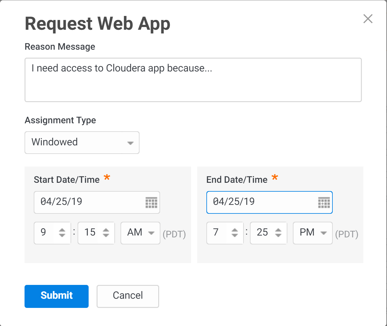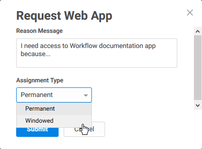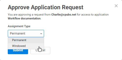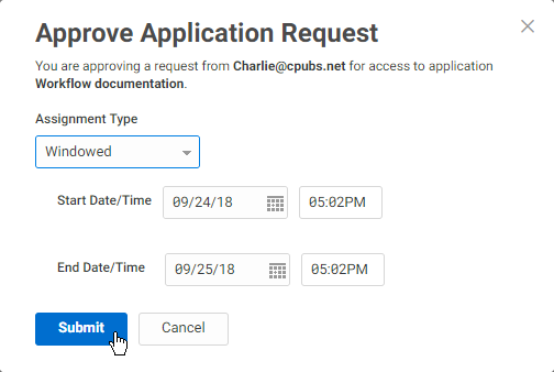 You can select a windowed approval regardless of the assignment type requested by the user. For example, you can approve access for a windowed time period if the user requested permanent access, or you can change the time window if the user requested windowed access.