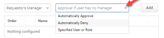 Note: If you choose Requestor’s Manager, you will also need to choose an option for how to handle the request if the user has no manager:
