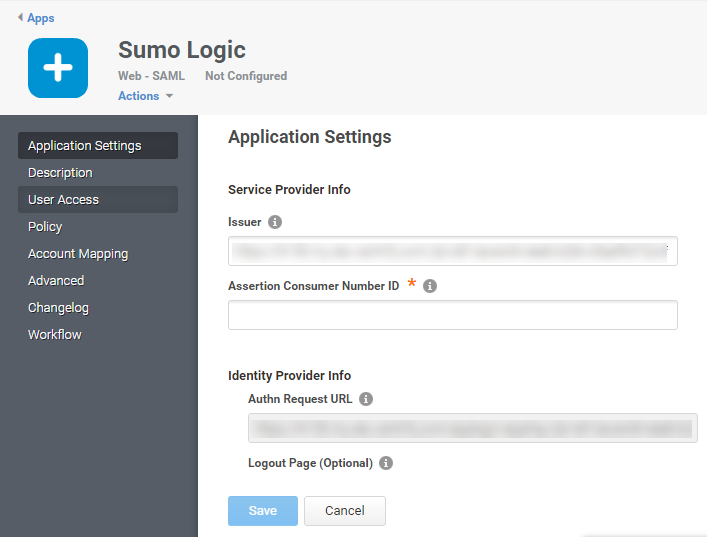 N/A Enter the Assertion Consumer Number ID you received from Sumo Logic. If your Assertion Consumer URL is https://service.sumologic.com/sumo/saml/consume/123456, enter 123456 here. -