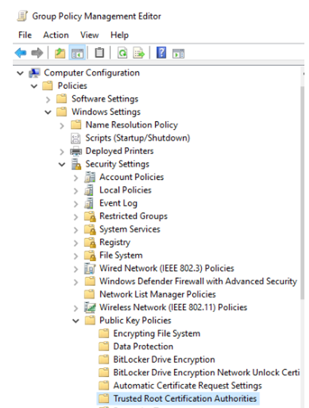 Select Computer Configuration > Policies > Windows Settings > Security Settings > Public Key Policies > Trusted Root Certification Authorities.