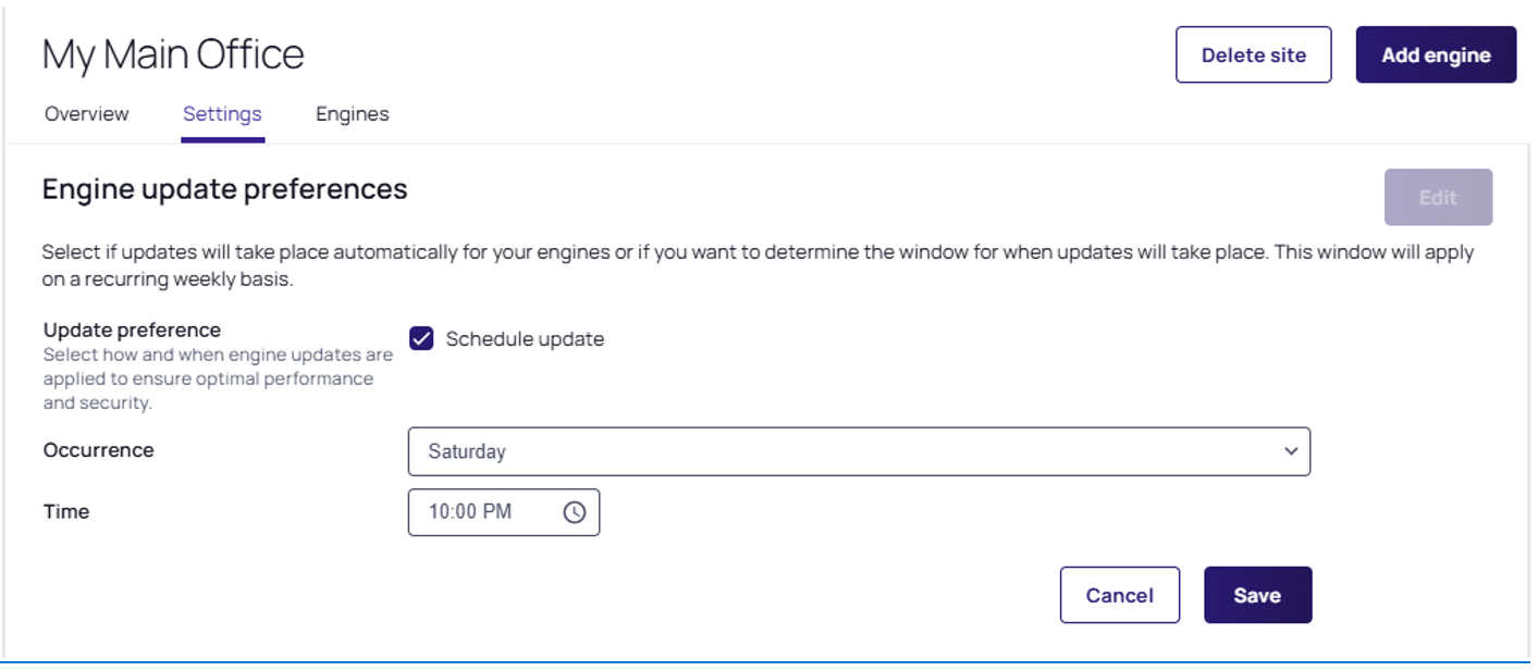 | Site | A group of engines selected on a common principle, such as network or subnet, geographical location (office, city, continent), data center, or any other characteristics. Workload settings are organized at the site level. |