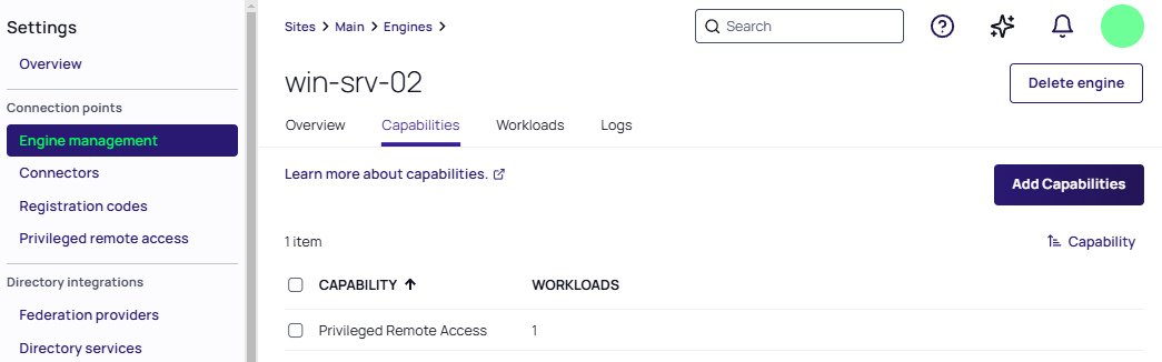 | Add Engine | Create a new engine. For this permission to take effect, the user must also have the additional permissions Create Registration Code and Generate a Device Code. | delinea.enginepool/engine/create | N/A | Yes |