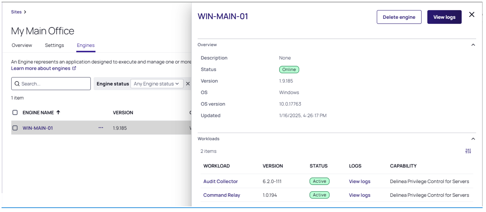 The Delinea Platform manages and protects endpoints using small software packages called engines that handle the orchestration of Delinea services called workloads.