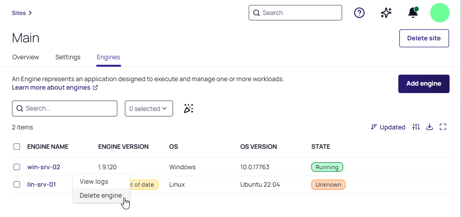 Select the site where you want to delete an engine.