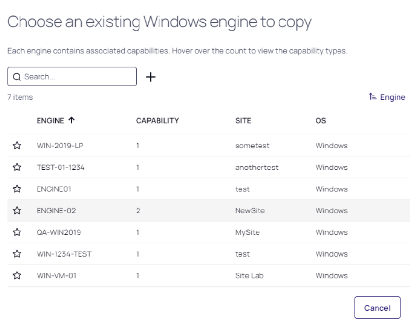 Click Copy existing engine. The following dialog is displayed: Choose an existing Windows engine to copy.