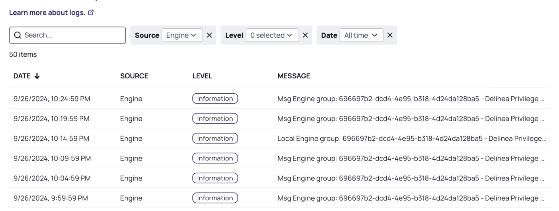 You can check logs of engines or logs of specific workloads by changing the value in the Source field.