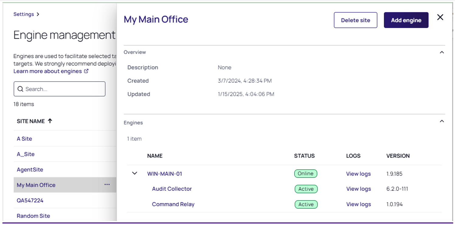 | Manage Sites | Ability to view summary information about all sites and make changes. | delinea.enginepool/site/manage | N/A | Yes |