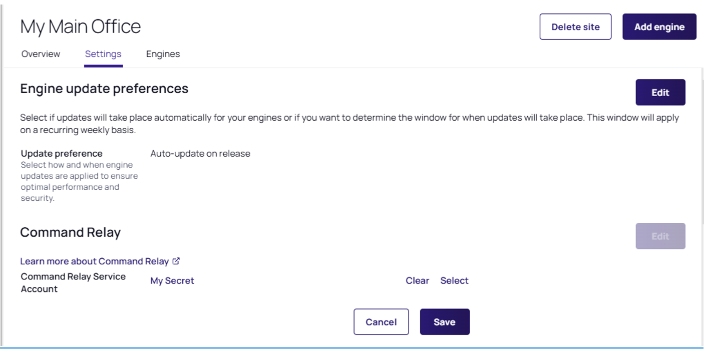 | Update a site | Ability to update a site. | delinea.enginepool/site/update | N/A | Yes |