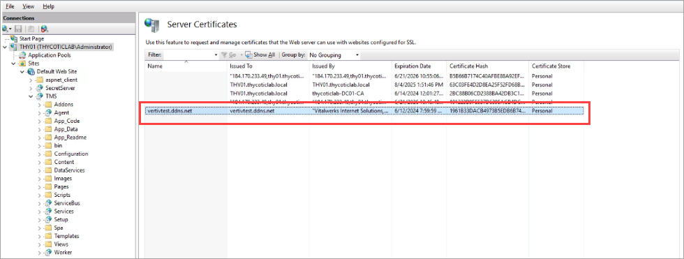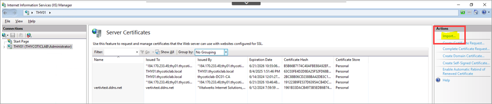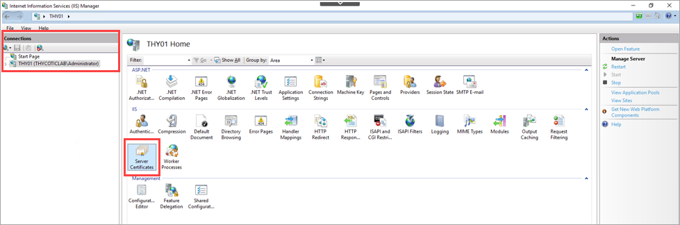 Select your server’s name under the Connections and double-click on Server Certificates.