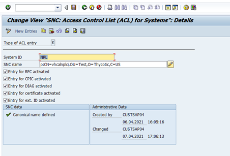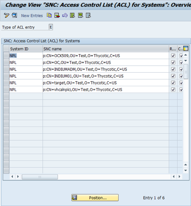 Click the New Entries button. The Change View "SNC: Access Control List (ACL) for Systems" panel appears: