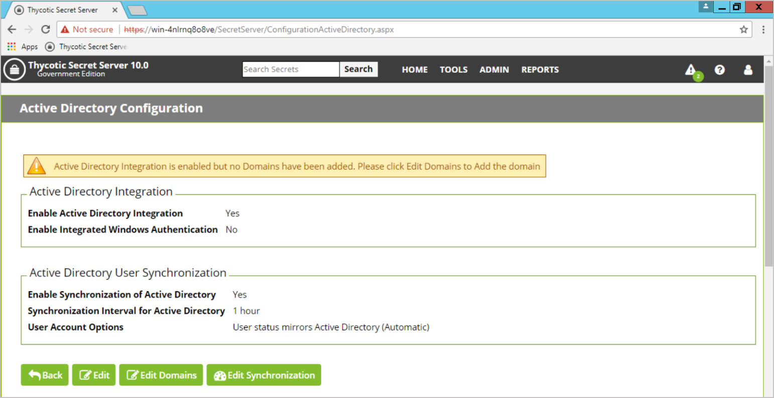 Once the domain has been added, click the “Edit Synchronization” button on the Active Directory Configuration page.