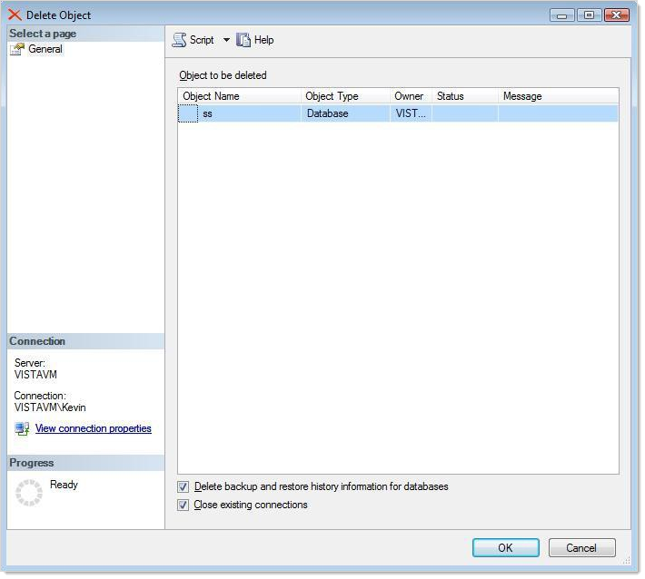 Ensure the Delete backup and restore history information for databases check box is selected.