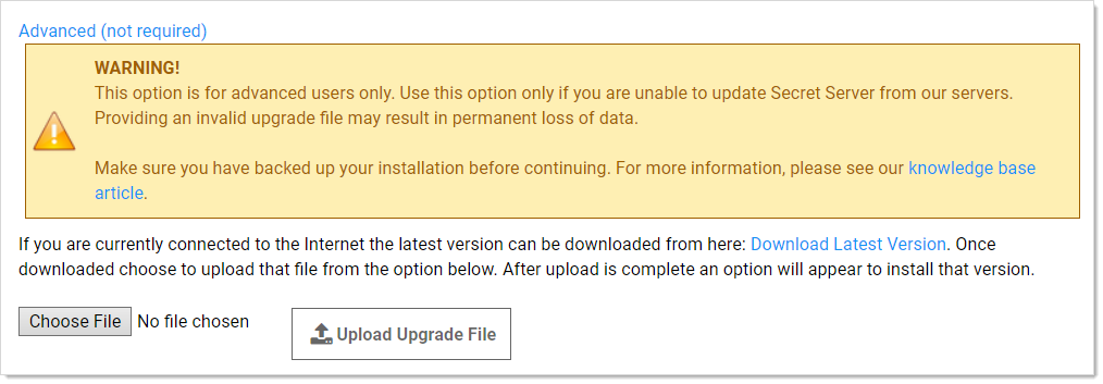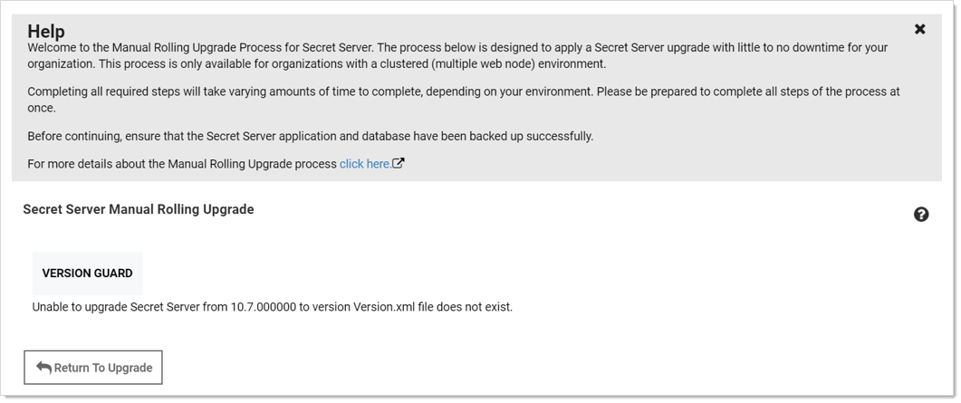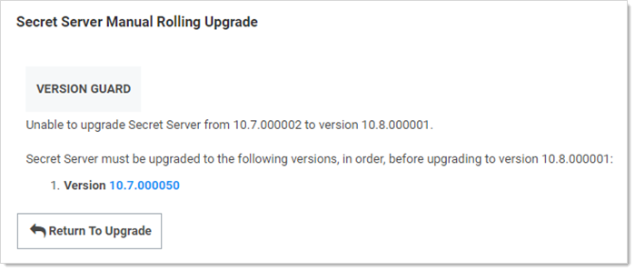 If an uploaded upgrade file cannot be used to upgrade the current version of Secret Server, then "Version Guard" will block the upgrade and provide instructions on how to continue: