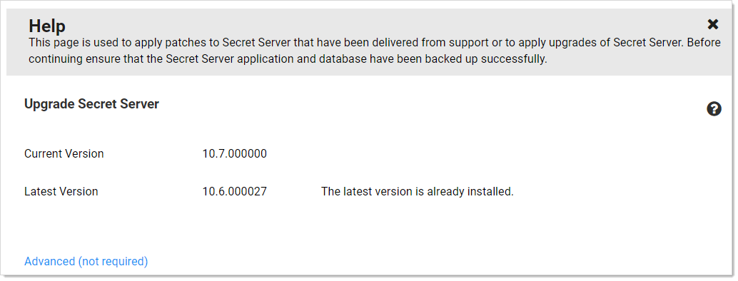 We recommend that you have a QA or test environment mirroring your production environment and that you first run this procedure through that environment to ensure the desired results occur, prior to attempting this in a production environment. As with any third-party application upgrade, we strongly recommend taking snapshots or virtual machine backups of your web, Secret Server distributed engine, and database servers so you can easily revert to a pre-upgrade state if issue arise during the upgrade.