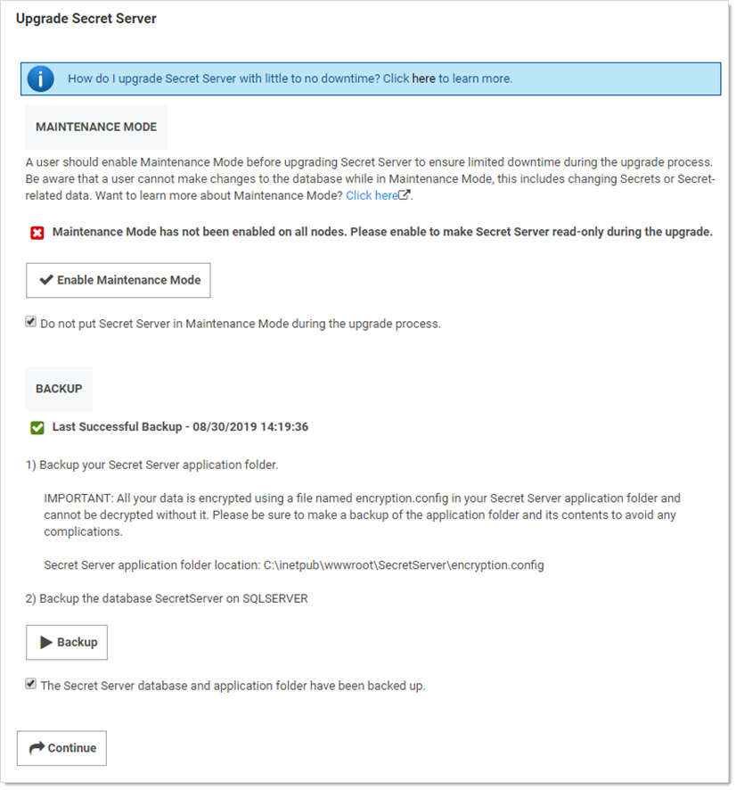 Important: Click to select the Do not put Secret Server in Maintenance Mode during the upgrade process check box.