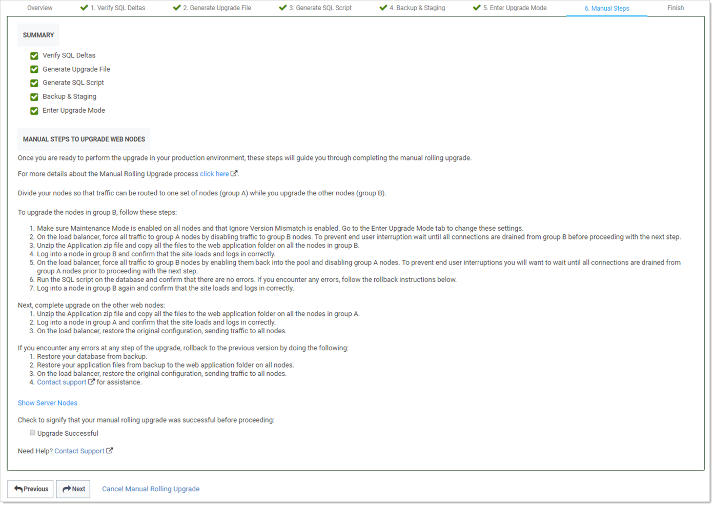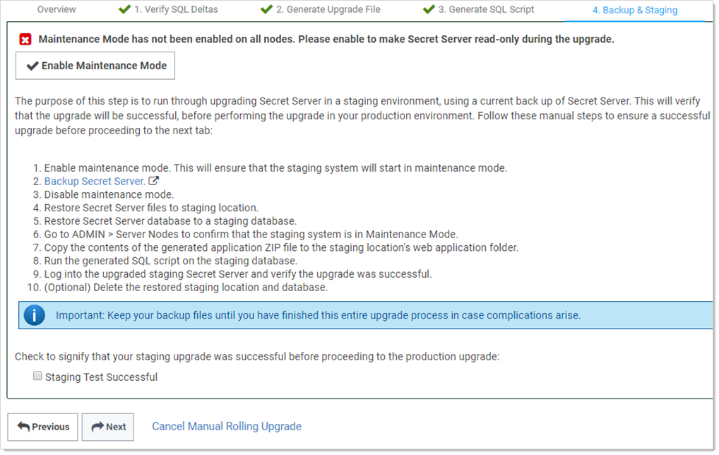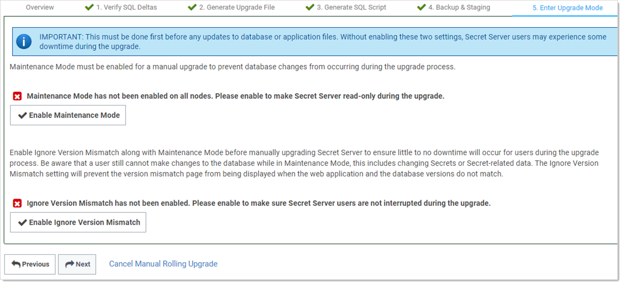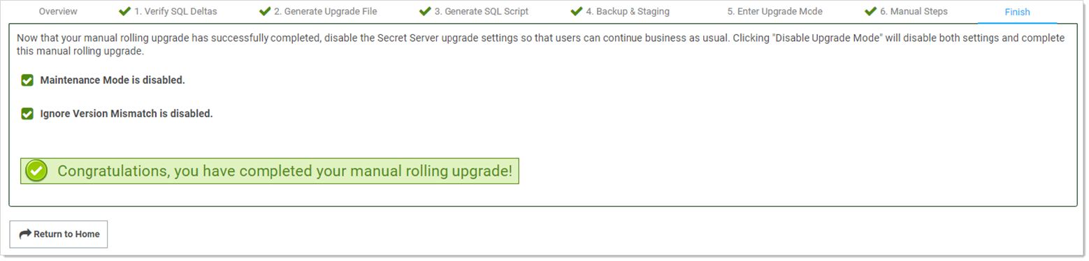 Clicking the "Cancel Manual Rolling Upgrade" link, at any time, will take you to the Install Secret Server Upgrade page. -
