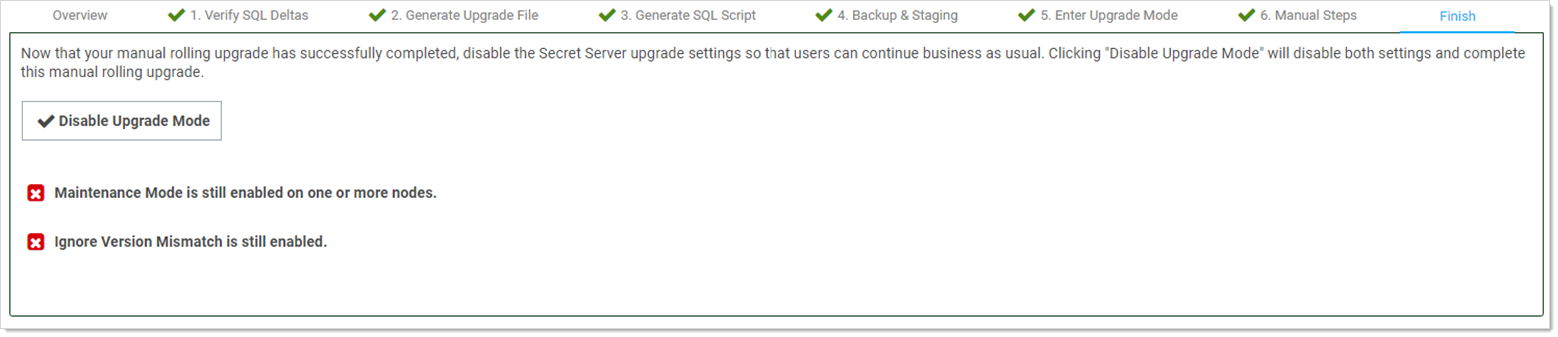 Click the Disable Upgrade Mode button. A Finish Manual Rolling Upgrade popup appears. This popup both disables maintenance mode and disables the ignore version mismatch setting.
