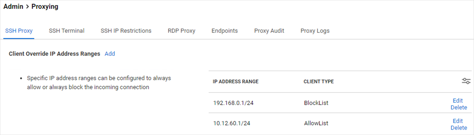 You can configure specific IP address ranges to always allow or always block an incoming connection. If allowed, authentication is still required to access the SSH proxy or SSH terminal services.