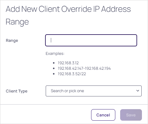 Type an IP address or range in the Range text box. You can use CIDR notation. Examples: