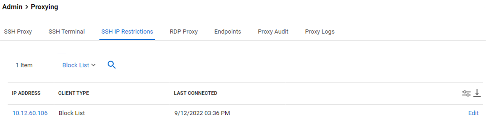 If an IP address is located on the SSH IP Restrictions page, you can view or edit its current SSH proxy block status. For example, a user may have inadvertently blocked her client IP for a number of reasons, such as testing the connection too many times in a short time period or performing a vulnerability or port scan against the proxy endpoint IP addresses.