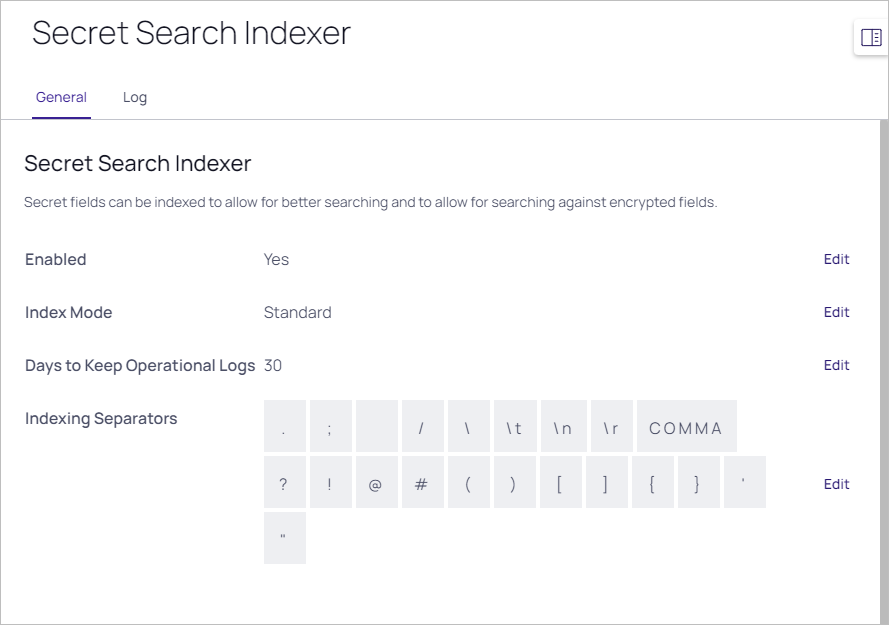 Click the Edit link to change the Days to Keep Operational Logs spinner to set the period to keep indexing-related logs that might contain PII. Secret Server automatically deletes logs older than that (in days).