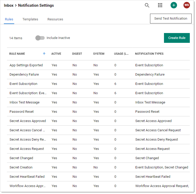 - Zero or more associated inbox rules. These are the inbox rule types that use this inbox template (message type). Rules define filters for the alerts or events (what characteristics trigger the rule) and who gets externally notified via email or Slack (the subscribed users or groups). The following table lists the system templates and their associated inbox rules that use them.