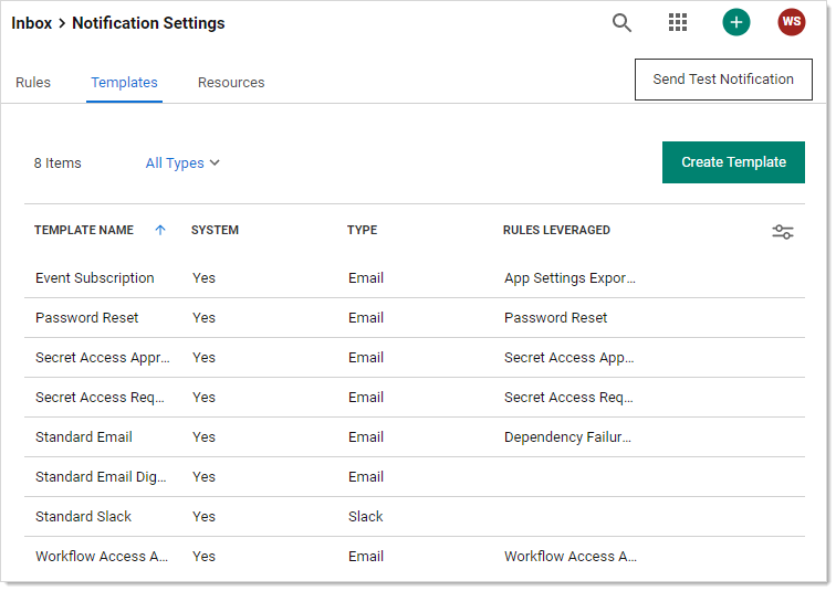 Note that most, if not all, of the inbox templates are system templates. These are read-only templates that you can clone to create custom templates. That is, system templates are templates for your templates. Most of the templates are email templates, and one is a Slack template.