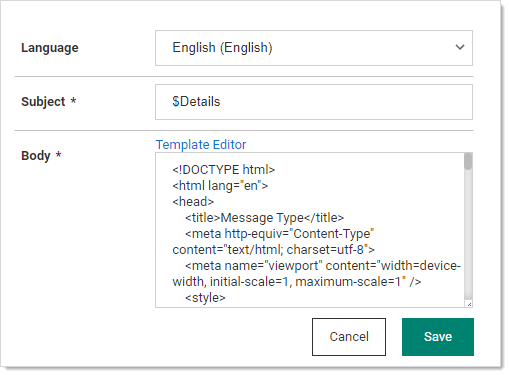 - A body section that defines the subject, language used, and the canned text for the message. The message contains variables that are drawn from the alert or event. The body is read only in system templates and is editable in custom templates cloned (copied) from system templates.