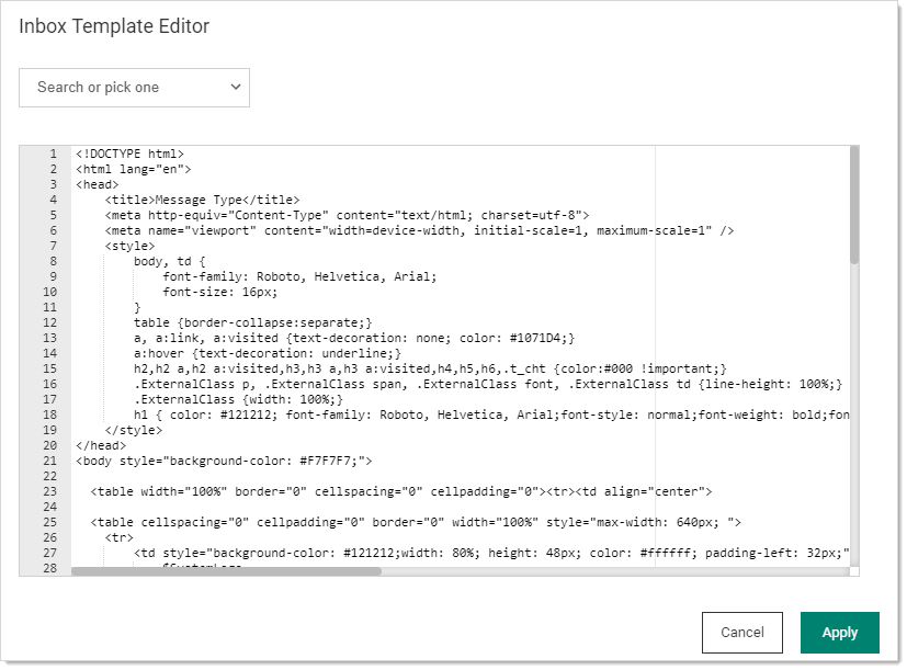 You can directly edit the HTML, but if you intend to add variables for Secret Server to fill in, click the Template Editor link. The Inbox Template Editor popup appears: