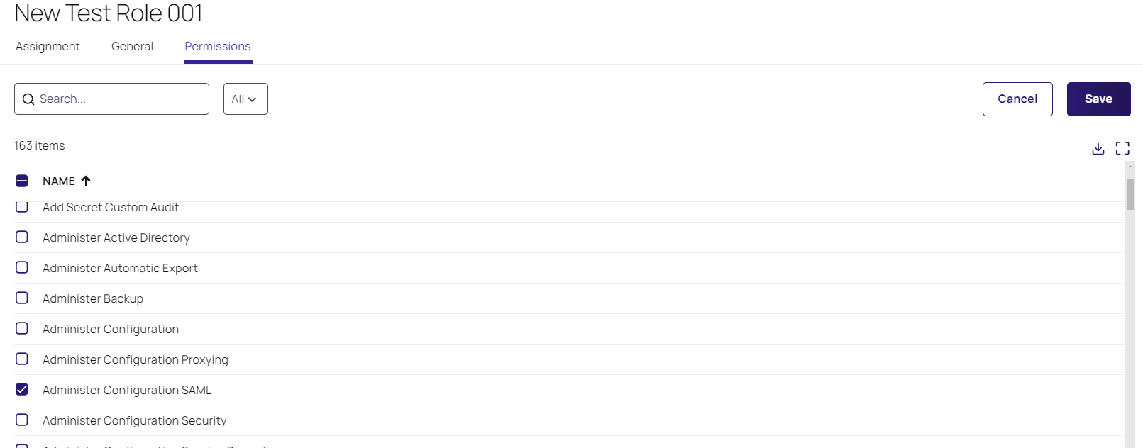 Select All next to the search box, select Administer Configuration SAML from the list, and click Save.