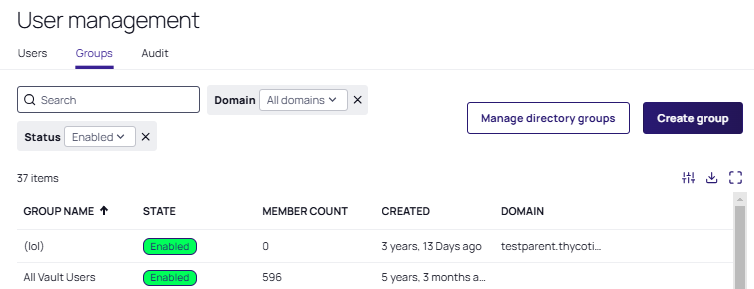 Go to Access > Groups. The Groups tab of the User Management page appears: