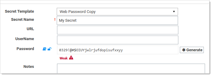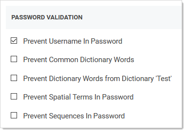 Now, when defining a password requirement, the custom dictionary you created ("test") appears as a prevention option:When a user attempts to include one of the excluded words in the dictionary in a secret based on the template using the password requirement, the "weak" warning appears and the user cannot save the password. For example, our dictionary contains the word (string)